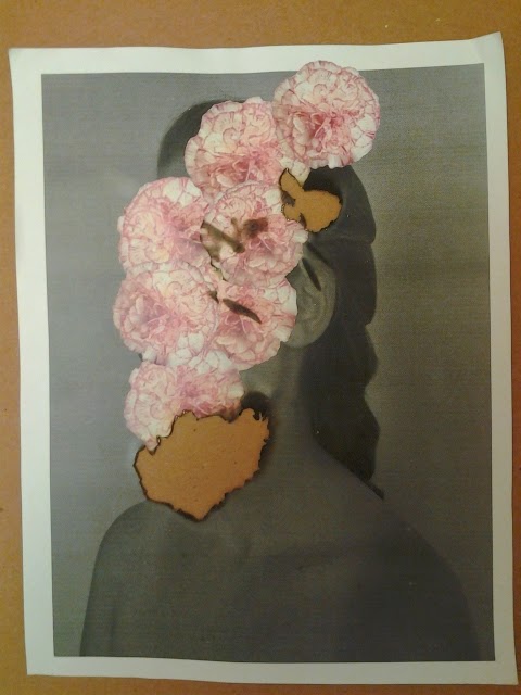 This weeks works I wanted to express how in our society we value beauty and constantly adorned ourselves with different objects to obtain high standards of beauty. I chose to cover the faces with flowers because universally flowers are regarded as being beautiful. I also chose flowers because though they are beautiful eventually they wither and die. I did this to parallel with the fact that beauty doesn't last forever as everyone grows old. For some of the images I want to keep the image pretty as a subtle way of expressing the above thought. With the others I wanted to make it a bit more obvious how beauty fades by experimenting with ways of destroying the images as to take away some of their beauty.